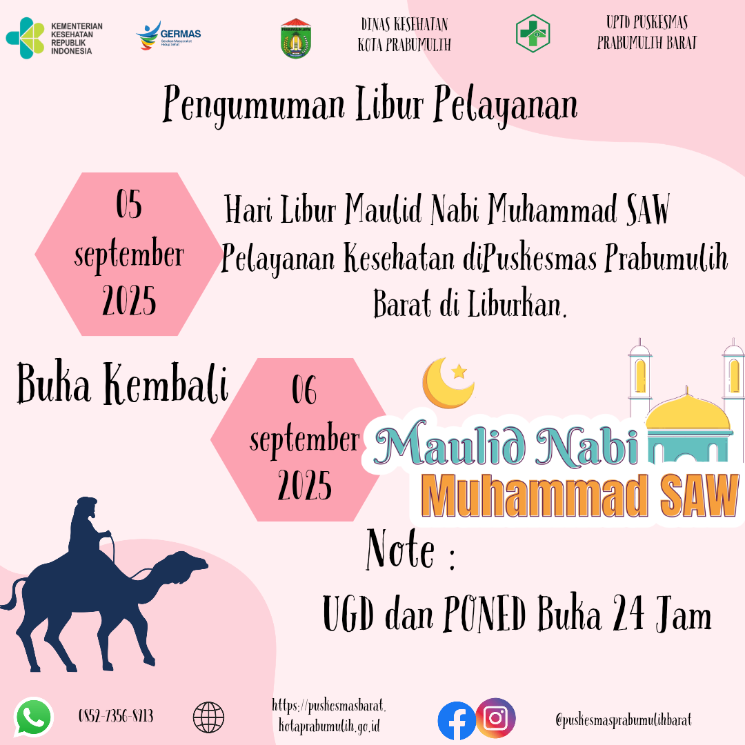 Pengumuman Hari Libur NasionalPengumuman Hari Libur Nasional Sehubungan dengan Hari Libur dalam rangka memperingati Hari Maulid Nabi Muhammad Saw yg Jatuh pada tanggal 05 September 2025 , maka Pelayanan Kesehatan di Puskesmas Prabumulih Barat diLiburkan. Buka Kembali tanggal 06 Septe